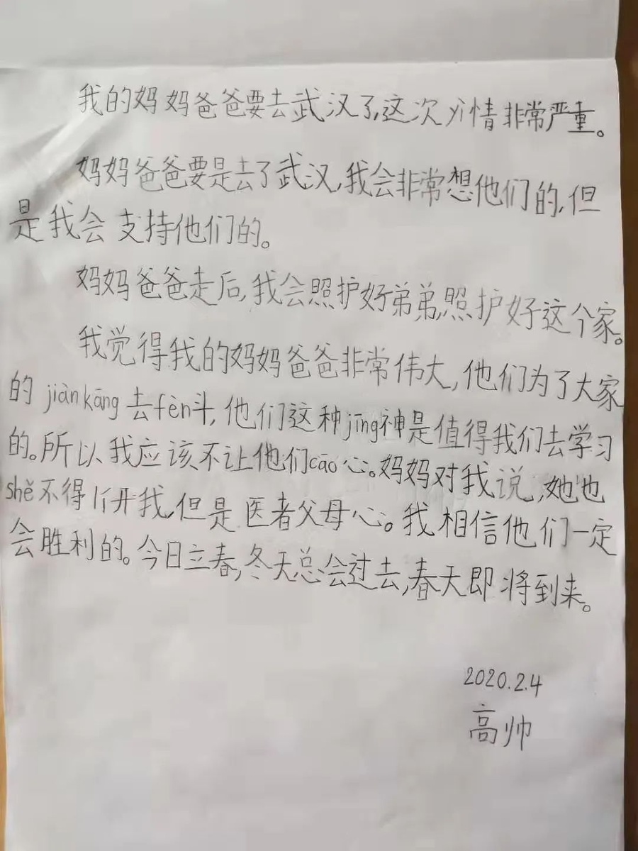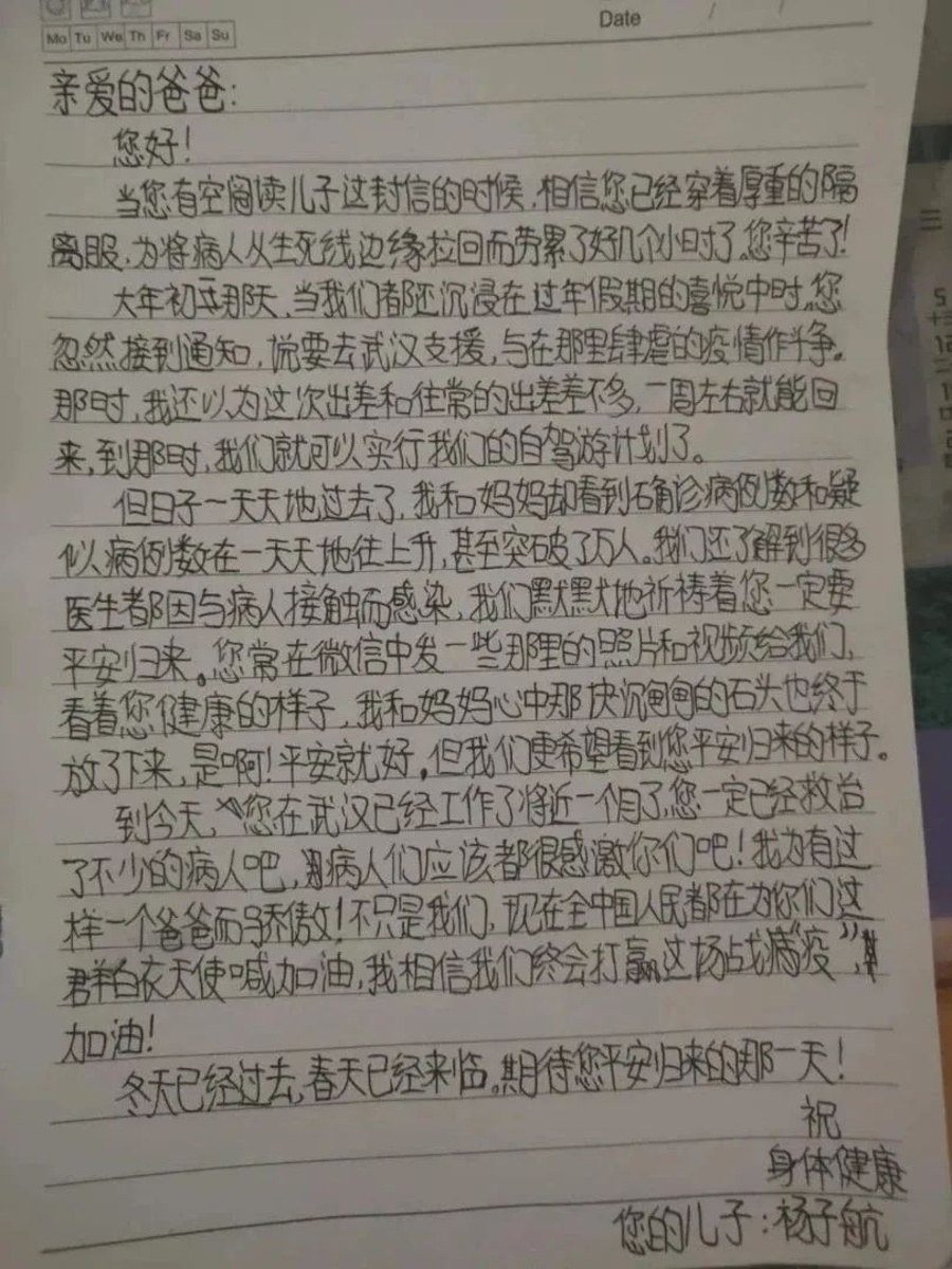 生日快樂!你寫來的信爸爸昨天沒來得及讀,因為要上夜班,上班期間是不能帶手機的。今天爸爸幾乎是含著淚讀完的,爸爸很想陪你度過一個愉快的寒假的,包括我們的自駕游,可是這場突如其來的疫情打亂了我們的計劃,你的學習計劃,也打亂了幾乎所有人的計劃。好在很多像爸爸一樣的人都來支援武漢了,我們并肩作戰,共同抗擊疫情,相信疫情很快就會結束,新聞報道疫情正在向好,爸爸所在團隊管理的患者也康復了一半多點了,他們都很感謝我們。