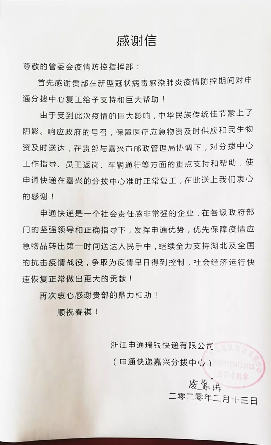 近日,申通快遞嘉興分撥中心向嘉興秀洲區經濟開發區管委會疫情防控指揮部送去了一封感謝信。
