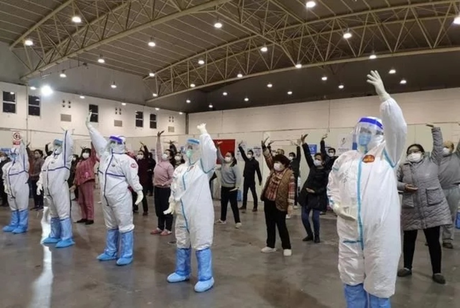 醫(yī)務(wù)人員與患者在做八段錦。(八段錦功法是一套獨(dú)立而完整的健身功法,起源于北宋,至今共八百多年的歷史)。