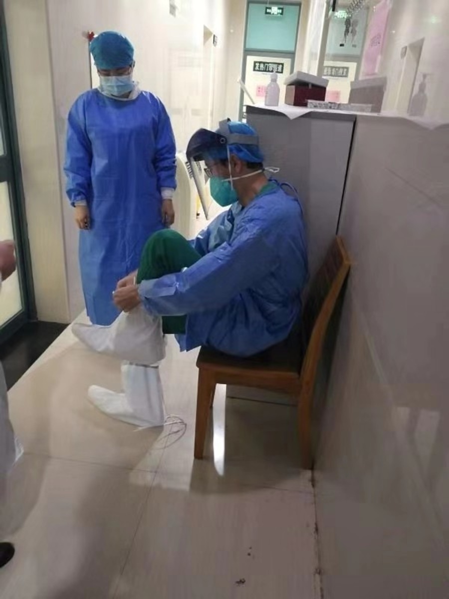 作為一名骨外科醫(yī)生,之前畢竟不太了解,只有親身經(jīng)歷過之后,才理解災(zāi)難面前為什么需要這么多人員。大家面對的畢竟是一種會經(jīng)空氣傳播、目前尚有諸多未知因素、缺乏有效治療方案的病毒,每人都要全副武裝。在發(fā)熱門診,即使什么都不做,僅僅穿、脫衣服的過程就要需要將近半小時,所以大家都盡量少喝水、不上廁所。沒法用手機,其他的工作人員在沒有防護(hù)的情況下也不會進(jìn)到這個診區(qū)來,只有一部診室的固定電話聯(lián)系。剛開始的感覺就是盡管同在一個醫(yī)院里、似乎有點像在孤島上的情形。想一想,我如果出自己科室的門診,坐一天都沒問題,但在這種條件下,無論對心理還是身體確實都是考驗。