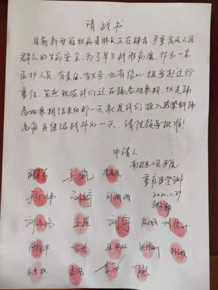 雖然被隔離觀察,但田紅麗和重癥醫學科的主任周連軍,在微信中提出一個倡議:寫下請戰書,一旦解除隔離,大家繼續回到救治一線,肩負起醫護人員的職責和使命。