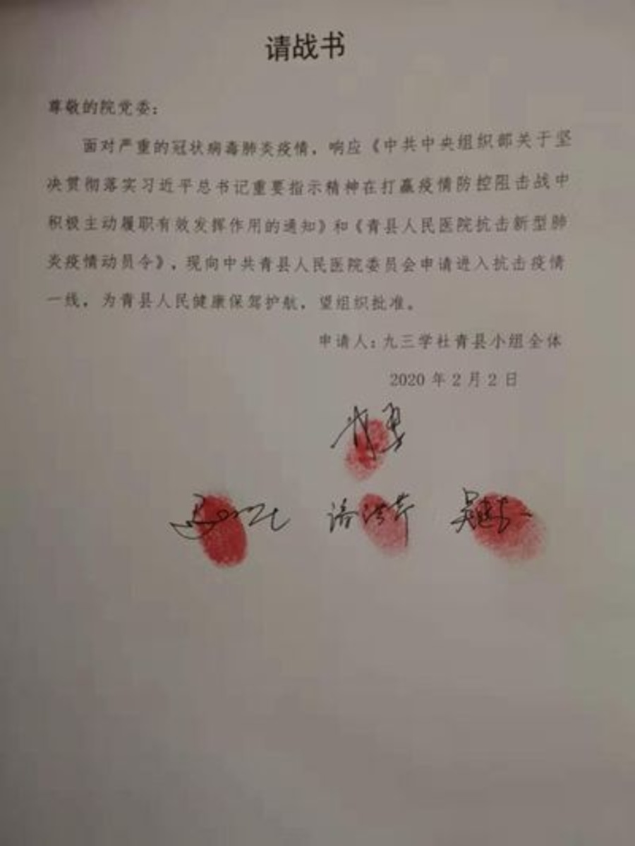 新型冠狀病毒感染的肺炎疫情發生以來,感染病例持續增加,全國疫情嚴重。作為醫務人員,九三學社青縣小組的四名社員同樣奮戰在青縣抗擊疫情一線。面對這場無硝煙的戰役,他們毫無所懼,主動遞交請戰書要求進去抗擊疫情一線,與一線醫務人員并肩戰斗,同時每人捐款500元用于疫情防控。這封請戰書,充分表達了九三學社社員不畏困難、隨時待命、趕赴一線的決心,表現出九三學社社員、醫務工作者的社會責任與使命擔當,用實際行動踐行九三人嚴守初心、嚴守醫生職業情操的承諾。