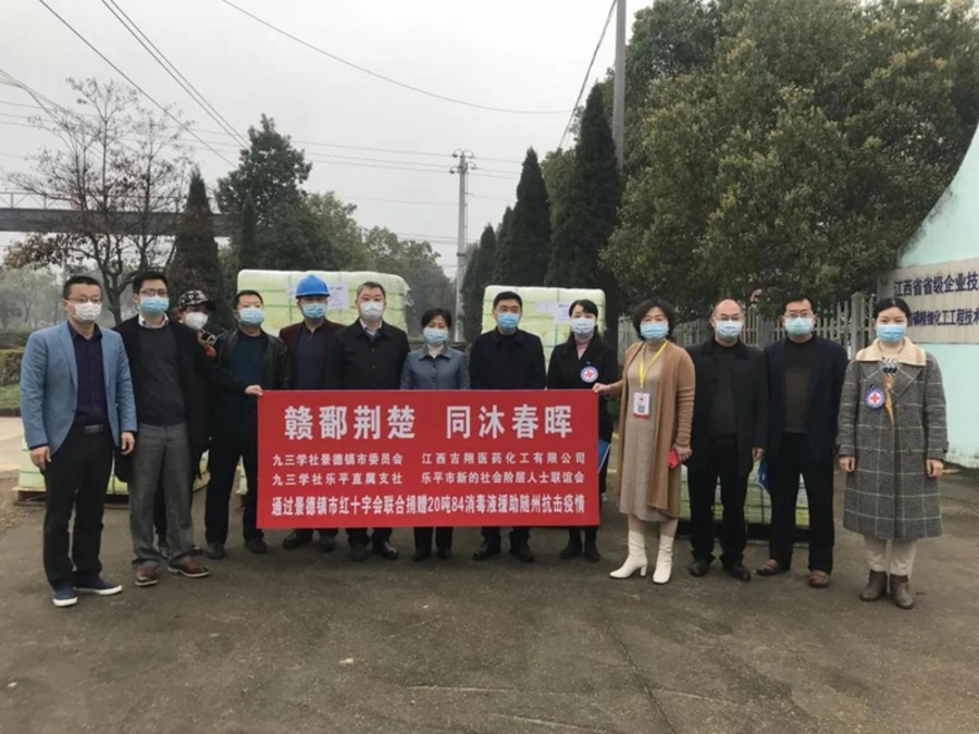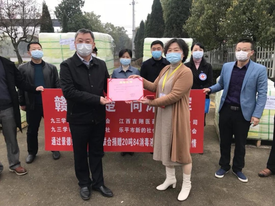 3月13日,九三學(xué)社景德鎮(zhèn)市委會聯(lián)合江西吉翔醫(yī)藥化工有限公司向湖北隨州捐贈20噸84消毒液,用于援助隨州市抗擊新冠肺炎疫情。景德鎮(zhèn)市委統(tǒng)戰(zhàn)部副部長黃濤,景德鎮(zhèn)市紅十字會黨組書記俞定珍,九三學(xué)社景德鎮(zhèn)市委會主委于長征,副主委陳莉、方曉娟,樂平市委常委、統(tǒng)戰(zhàn)部部長王慧娟,樂平市副市長方靜出席捐贈儀式。