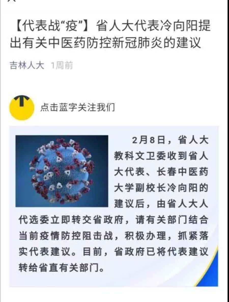 九三學社長春中醫藥大學委員會組織專家組團隊研制出防控方,用于防控新冠肺炎疫情;九三學社吉林市醫藥專委會整理推薦增強免疫力的方劑和茶飲;九三學社吉林省委副主委冷向陽提出《關于中醫藥防控治療新冠肺炎方案的建議》已經轉交省政府;九三學社長春中醫藥大學委員會提出了《關于加強我省文明衛生治理的建議》;九三學社四平市委提交《關于對全市出租司機進行新型冠狀病毒肺炎疫情進行重點聯防聯控的提案》……