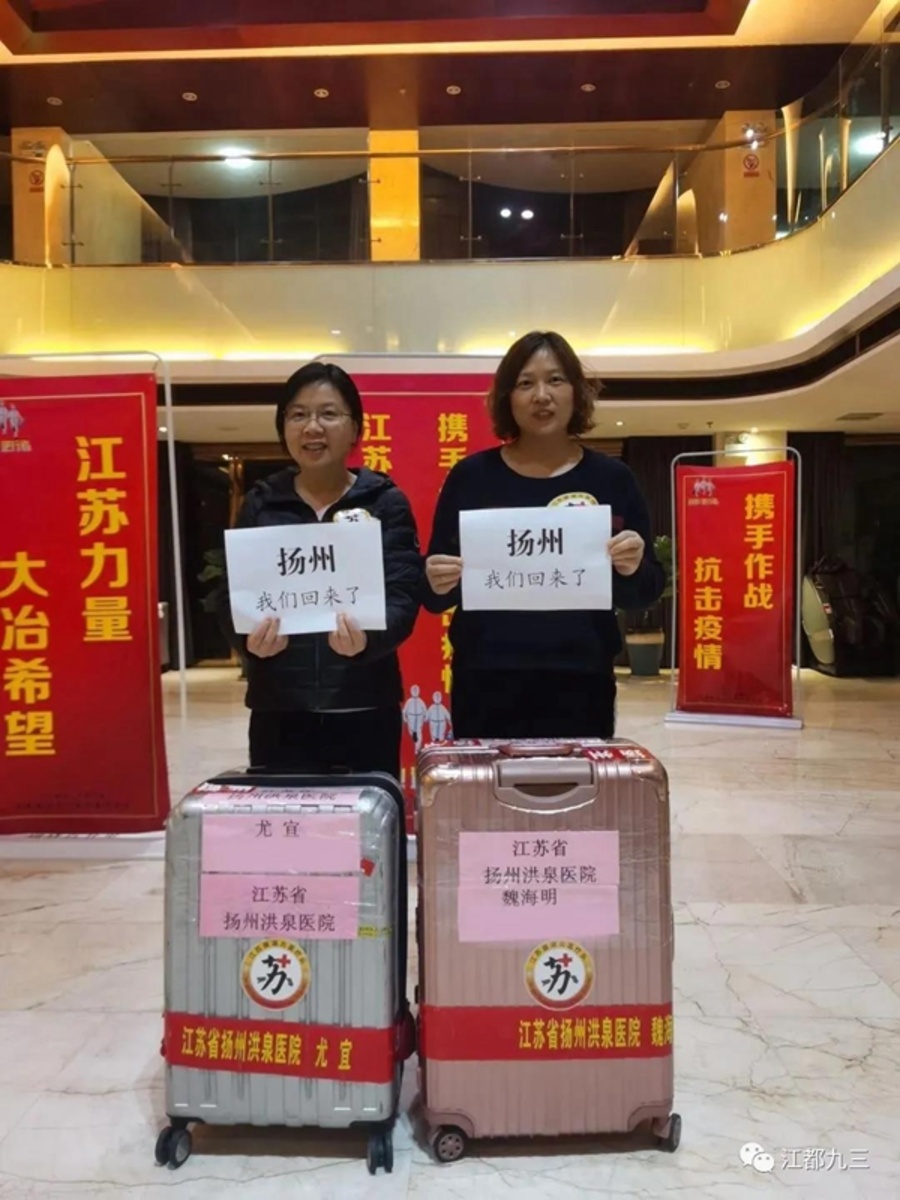 38天前,尤宜和魏海明匆匆出發(fā),走過雨水,跨過驚蟄,今日春分,她們回家了。此刻,迎接她們的揚(yáng)州城已是瓊花綻放,分外美麗!歷時(shí)一個(gè)多月的鏖戰(zhàn),她們不辱使命,圓滿完成抗“疫”任務(wù),勝利歸來!