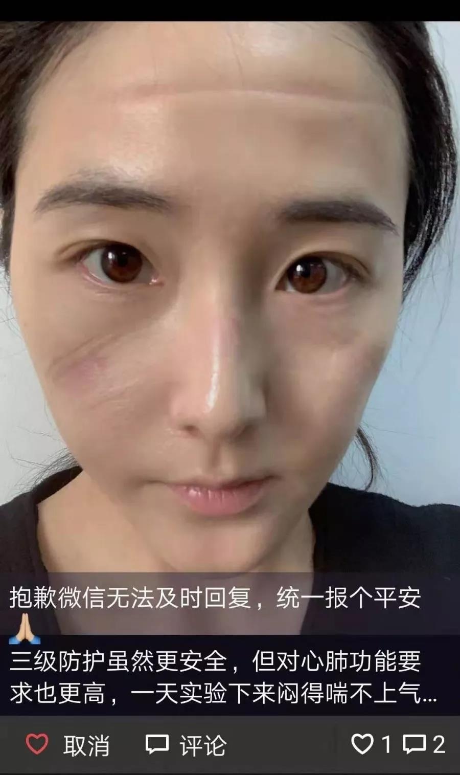 手上、臉上都是深深的印子。社員杜鵑在朋友圈說:三級防護雖然更安全,但對心肺功能要求也高,一天實驗下來悶得喘不上氣。