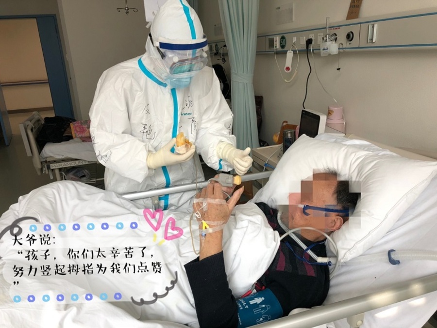 今天武漢的天氣格外晴朗,終于見到久違的明媚陽光,真是有種撥開云霧見天日的感覺!進入病區后直奔51床,看望一直使用無創呼吸機的程大爺,他終于脫機改為高流量吸氧了,真的是件高興的事。但是程大爺的情緒不是很好,和大爺交談后得知,原來同時感染的老伴身體已經恢復可以出院,而他要留在醫院繼續接受治療,所以心里格外難受,一邊說著一邊還抹著眼淚。其實我知道,大爺是在害怕,老伴兒出院回家,擔心自己再也看不見她了……是啊,50年來相濡以沫走過半個世紀。我的眼睛濕潤了,握著大爺的手說:“別哭,一會兒我們跟醫生溝通,讓大娘再住幾天,好嗎?”大爺聞話秒說:“好、好、好”,然后努力舉起夾有血氧的大拇指為我點贊,露出了安慰的笑容。