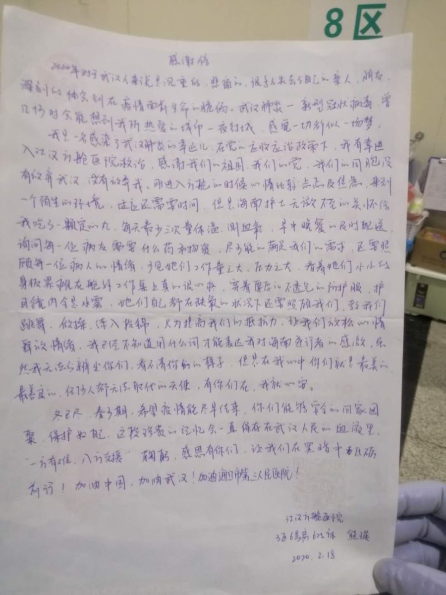 來自海口市第三人民醫(yī)院社員陳蘭在2月18日迎來了他們護(hù)理的患者出艙,連日來,他們無私奉獻(xiàn)、不懼危險(xiǎn)、勇于同病魔作斗爭的辛苦終于結(jié)出碩果,“量體溫、測血氧、配送中晚餐……”,對(duì)患者無微不至的照顧換回了醫(yī)患之間這脈脈的溫情,他們紛紛向海南馳援武漢的醫(yī)護(hù)人員的無私奉獻(xiàn)、精湛醫(yī)術(shù)表示崇高敬意,甚至在此分別的時(shí)刻還依依不舍。患者的這封感謝信凝結(jié)著陳蘭無數(shù)的汗水,更飽含著在這群白衣天使的呵護(hù)下戰(zhàn)勝疫情的必勝信心。