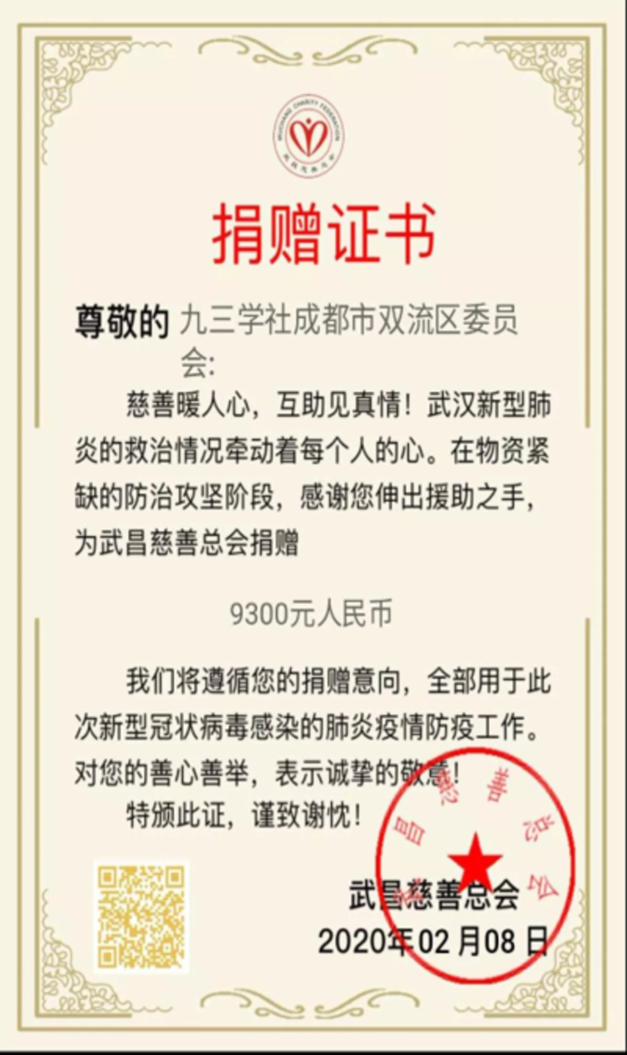 2月8日晚,微信“發(fā)送”按鍵一點,屏幕的另一端,社武昌區(qū)委收到了這封書信。隨書信一道送達的,還有雙流九三人捐來的9300元愛心款。