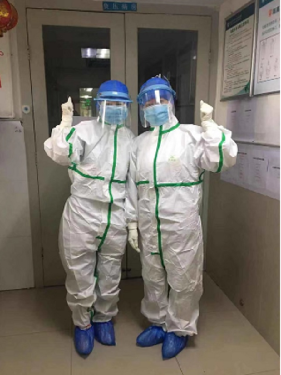 自貢社員楊瑩(左)在市一醫(yī)院板倉感染科負壓病房前
