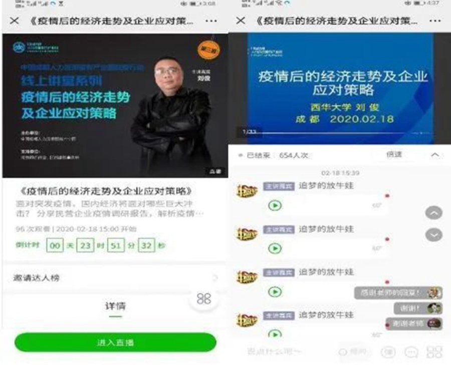2月18日,應(yīng)中國成都人力資源產(chǎn)業(yè)園的邀請,劉俊副教授通過在線網(wǎng)絡(luò)平臺,為產(chǎn)業(yè)園100多個復(fù)工復(fù)產(chǎn)企業(yè)開設(shè)公益網(wǎng)絡(luò)課程講座:《疫情后的經(jīng)濟(jì)形勢及企業(yè)的應(yīng)對策略》,600多位企業(yè)管理人員參加了該課程培訓(xùn)。
