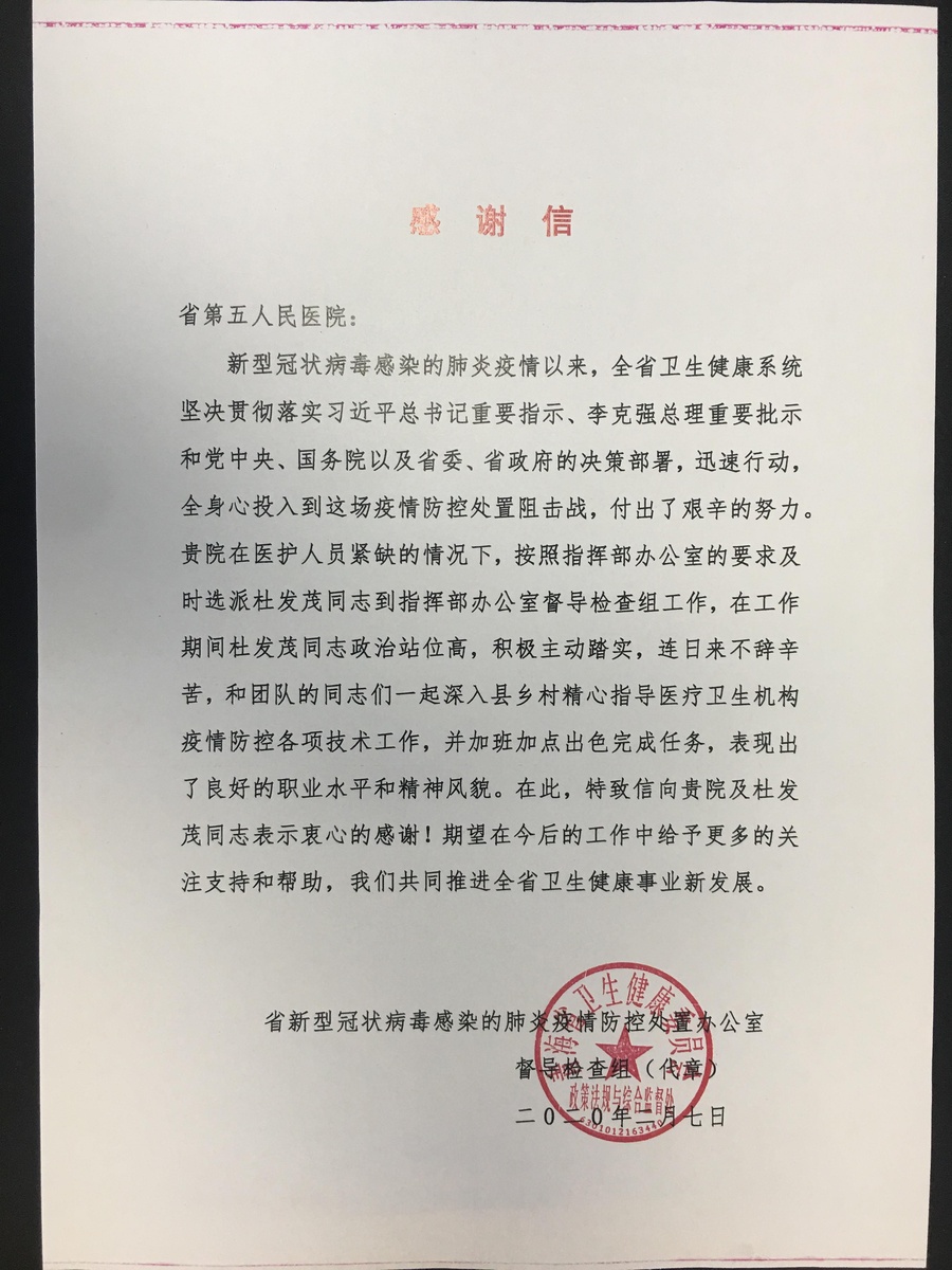督查組發感謝信向省第五人民醫院及杜發茂本人表示感謝。