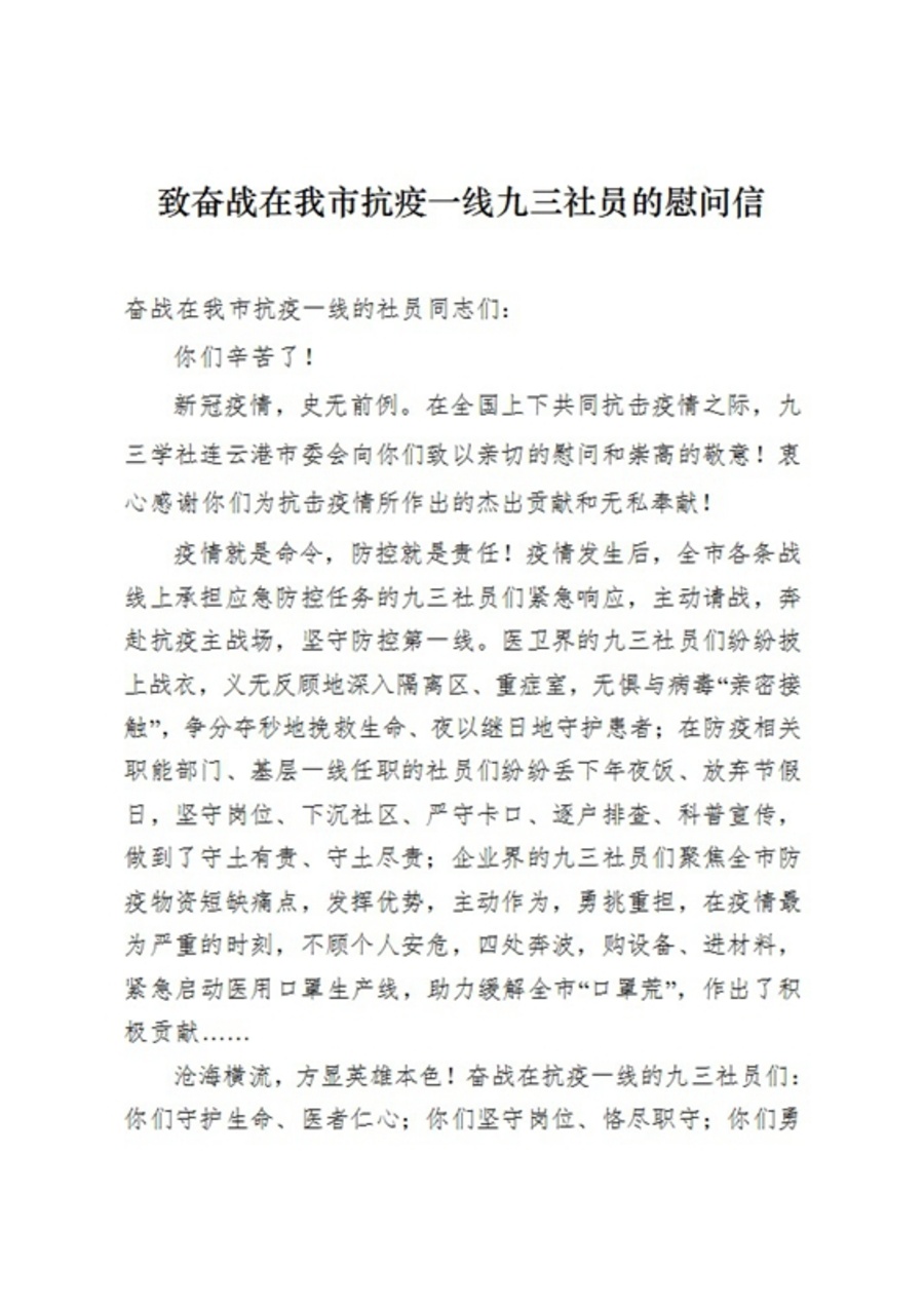 新冠肺炎疫情發生以來,九三學社連云港市委認真貫徹落實中共中央和省市委決策部署及工作要求,全社上下眾志成城,共抗疫情,各條戰線的社員們緊急響應、主動請戰,奔赴抗疫主戰場,堅守防控第一線,體現了九三學社的責任擔當,涌現出一大批忠于職守、不畏艱險、勇敢逆行的感人事跡和先進典型。