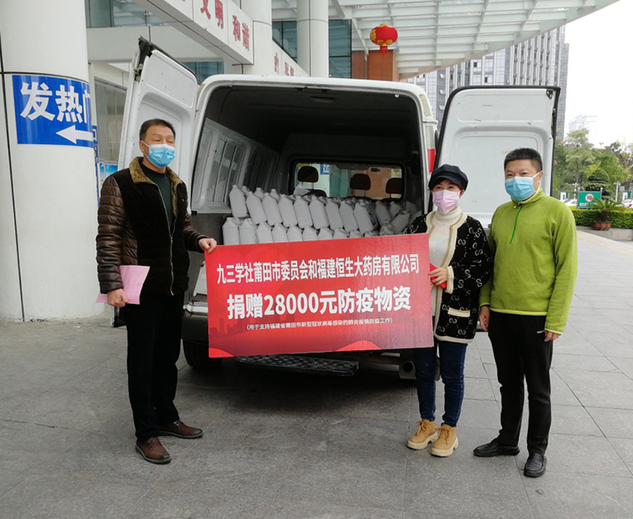 九三學社荔城區支社社員、福建恒生大藥房有限公司法人劉建花也急迫地想要為抗擊新冠肺炎疫情做出點貢獻。2月10日,她力促福建恒生大藥房攜手九三學社莆田市委向莆田學院附屬醫院捐贈了1.75噸、價值28000元的消毒液。