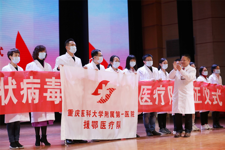 20名重慶醫科大學附屬第一醫院的醫務人員站成一排,他們即將出征,馳援湖北抗擊新型冠狀病毒感染的肺炎疫情。