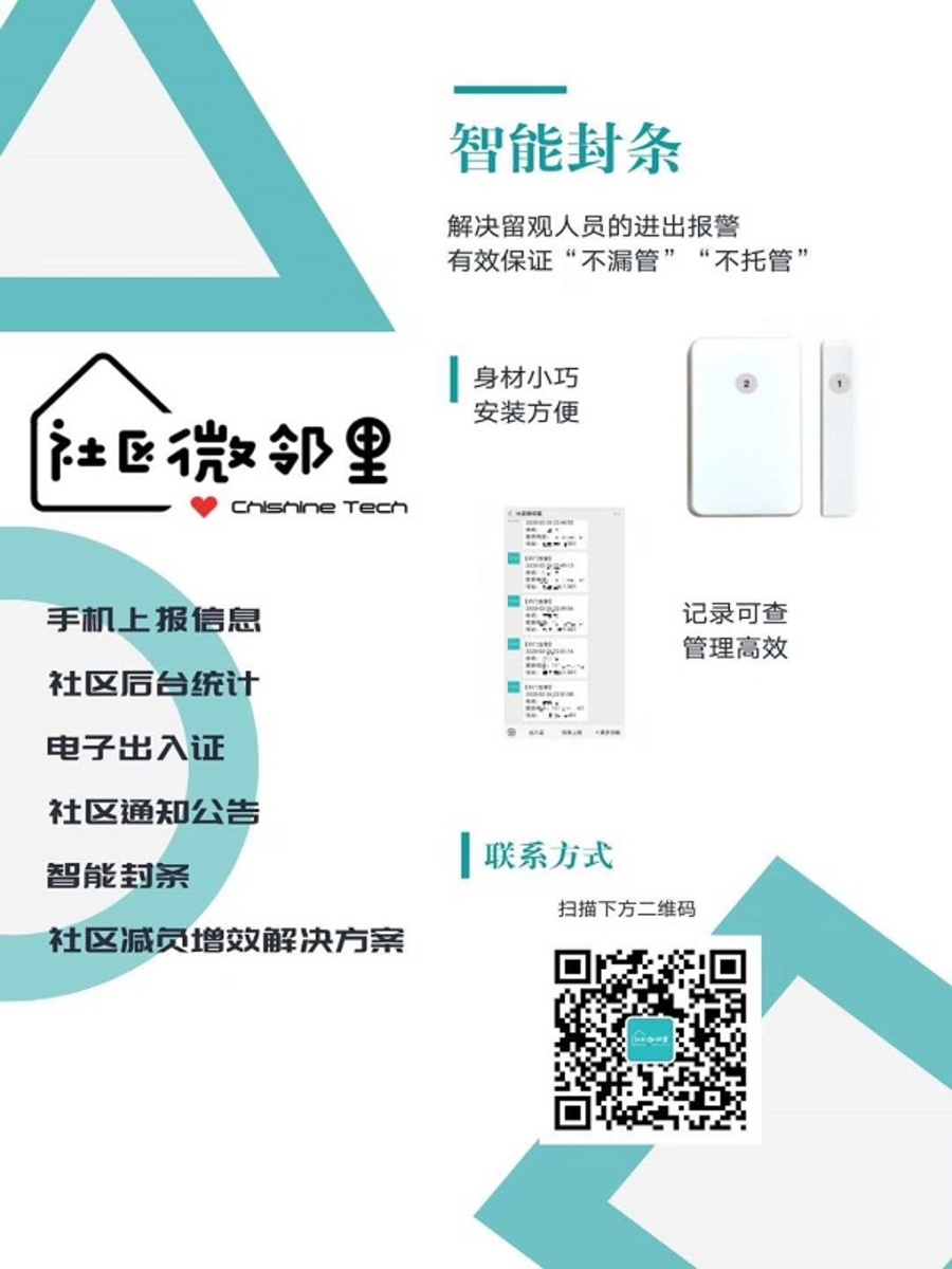 社區除日常工作以外,還面臨對居家隔離居民的一日三次溫度收集上報及送菜、收垃圾等服務性工作,加大了社區工作人員對居家隔離人員管控的難度。為發揮信息科學技術在疫情防控中的作用,提升防控效率,提高防控效果,智翔科技為天山區、水磨溝區、高新區、經濟技術開發區捐贈204套,價值60792元智能封條。該智能封條配合“社區微鄰里”公眾平臺預先錄入隔離人員的家庭成員、往返信息、手機號、隔離期限等基本信息,可以實現門磁對門的開關狀態監控。通過安裝智能門磁,實現了對居家隔離人員的24小時監管。