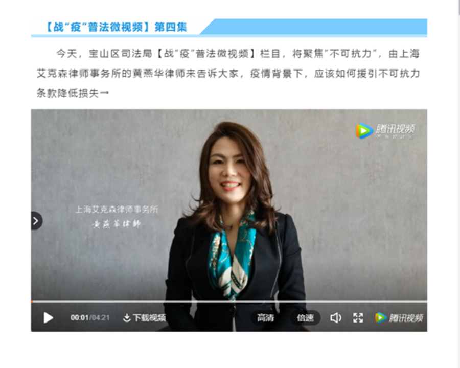黃燕華還先后參加了寶山區(qū)司法局《戰(zhàn)“疫”普法微視頻》、寶山區(qū)人民廣播電臺《與法同行》節(jié)目的錄制,解讀疫情下,個人和企業(yè)可能遇到的法律為題。