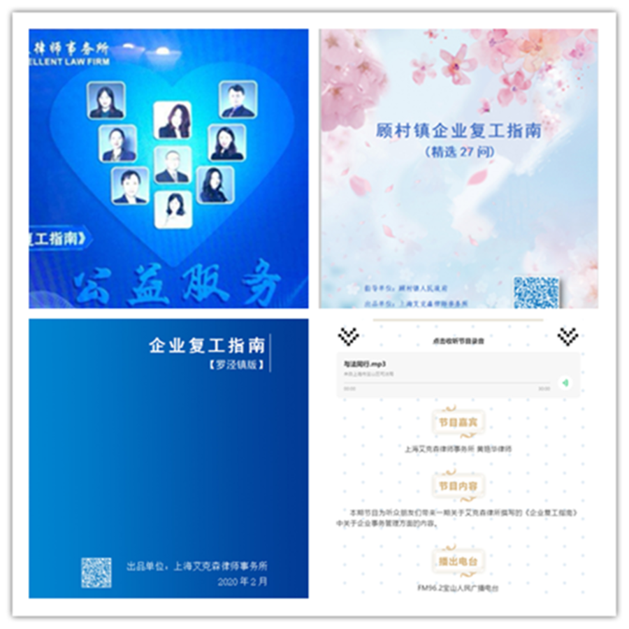 面對復(fù)工復(fù)產(chǎn),黃燕華帶領(lǐng)全所律師就疫情防控期間企業(yè)較為關(guān)心的勞動人事、合同履約等方面的法律問題,分別匯編了《顧村鎮(zhèn)企業(yè)復(fù)工指南》《羅涇鎮(zhèn)企業(yè)復(fù)工指南》《通用版企業(yè)復(fù)工指南》等,為企業(yè)合規(guī)經(jīng)營有序發(fā)展助力。