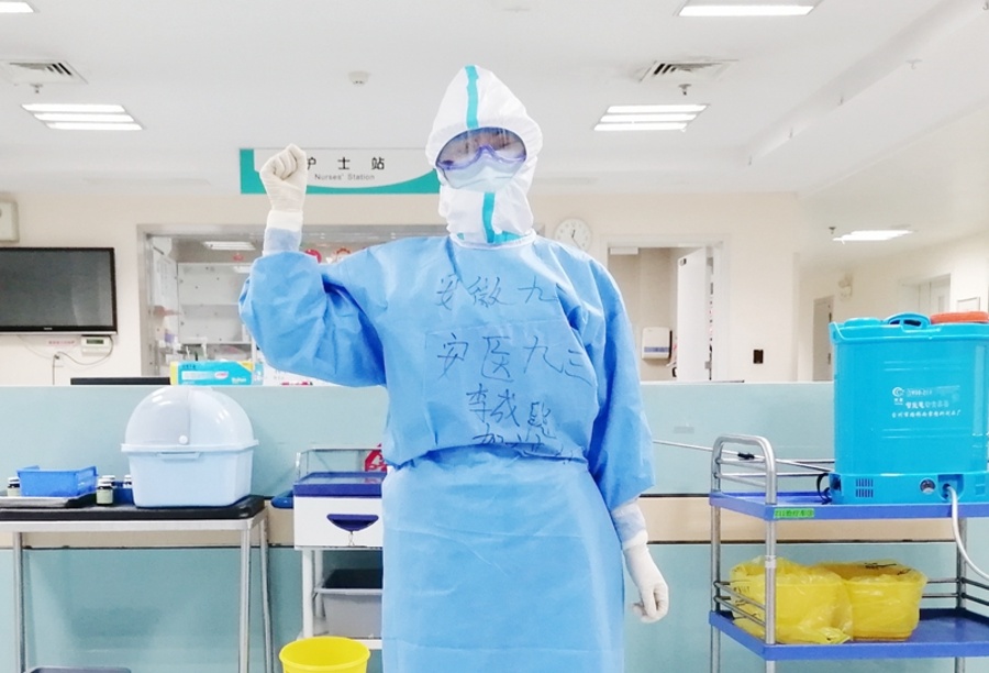 張奶奶是重癥患者,在我們的鼓勵和幫助下,她一直很努力地配合治療,與病毒頑強斗爭。看著她滿面愁容,媽媽的心里很不是滋味。該怎樣安慰鼓勵她呢?媽媽找不出別的話來,倒上一杯水遞過去說道:“奶奶,您喝點水吧,我們一起加油,很快您和家人就會團聚的!”奶奶豎起大拇指說:“非常感謝你們,聽說你們安徽來的,雖然看不清你們的臉,聲音我卻很熟悉,你們是英雄!”