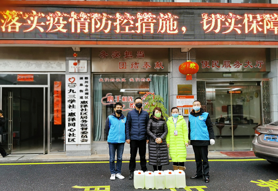基層社區(qū)處于疫情防控“戰(zhàn)場”的最前沿,也是疫情防控的重點和難點,社區(qū)工作人員為疫情防控付出了巨大努力,但是物資短缺給他們工作增添了困擾。疫情就是命令,劉艷紅立即聯(lián)系九三社員、市慈善總會副會長鄧德武,詢問之前聯(lián)系的消毒液什么時候能到貨,鄧德武即刻催促物流,終于在下午五點多把1000斤消毒液送到九三學(xué)社郴州市委,劉艷紅一刻也不敢耽擱,立即帶領(lǐng)志愿者將消毒液送到了北湖區(qū)下湄橋花園洞社區(qū)、涌泉街道惠澤社區(qū)、保和中心學(xué)校、大塘中心學(xué)校等地,為他們解了燃眉之急,并將籌措到的20多只口罩也交給了花園洞社區(qū)。
