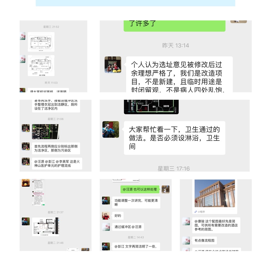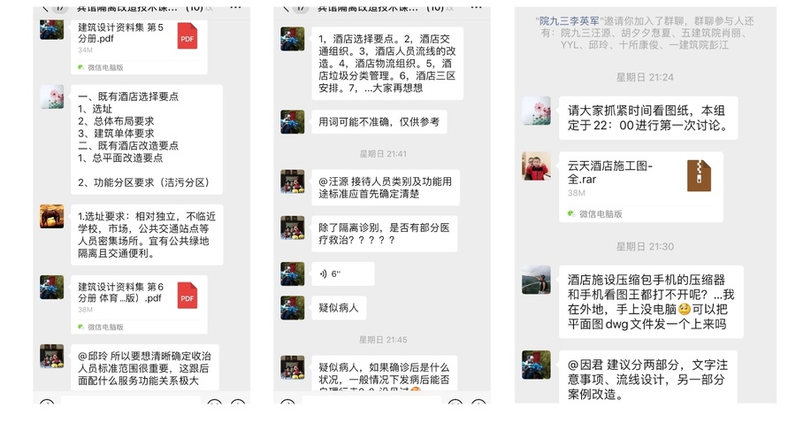 項目組于2月2日晚緊急成立,汪源副主委對成員進行分工,強調了時間的緊迫性與任務的重要性。大家晝夜趕工,針對賓館的選擇、建筑功能的調整和優化、外部交通的組織、內部流線的安排、后勤保障安排、通風系統的修改、污水的臨時處理、電力保障等,秉承高效、經濟、安全的原則進行圖紙設計、案例改造,不僅多次召開網上視頻會議對方案進行反復討論與修改,還與疫情一線醫生聯系溝通,準確把握隔離病房的要求。經過五天五夜的努力,《新型冠狀病毒感染肺病疑似患者集中隔離場所臨時改造設計導則(賓館類)》迅速出臺。