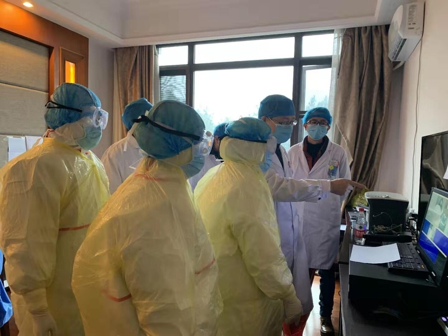 每天上午,李少雄會和同事們分析病人病情,及時對病人的診療方案進行調整,預設可能發生的意外情況做好相應的預案。病人大致分為三類:一類是由疑似轉為已確診感染的病例,立即送到市公衛中心集中治療;一類是解除醫學觀察的疑似病例,需要辦理出院并聯系相關部門送其回家;還有一類是仍然需要留在病區進行醫學觀察的疑似病例。為節省防護服,除診療外,李少雄還通過視頻、電話與病人溝通,每天電話的通話量達到100余通,每天晚上,還要參加醫療、護理、院感、保障等部門的總結會。工作強度非常大,一天的工作往往要持續到很晚才可稍作休息。
