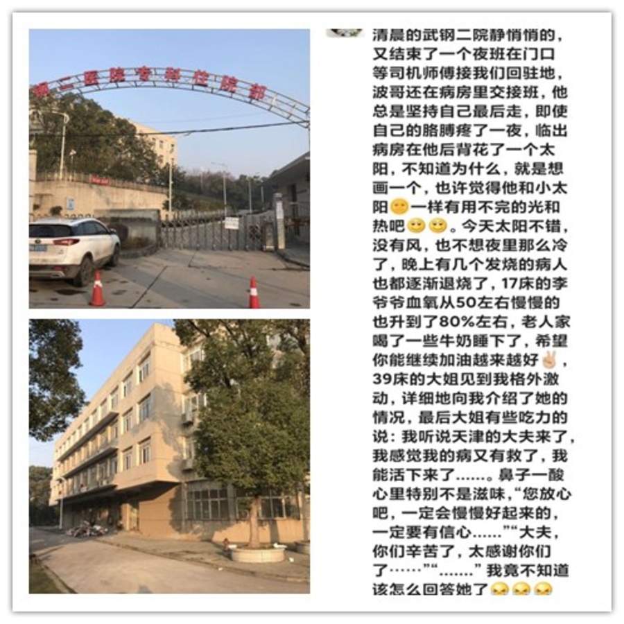 為防止交叉感染,病區內無法用手機拍照。那就讓看一段袁連方大夫書寫在武漢一線的日記吧——“在家里他們還是父母的小寶兒,在單位他們還是領導的得力臂膀,在這里他們剪掉長發、穿起戰袍變身成了真正的勇士,不畏艱難、勇往直前!每一次進入紅區都是在和時間賽跑、再向疾病發起沖鋒,他們來自不同醫院、不同崗位,在這里迅速凝聚成一支強大的隊伍,團結一致只為一個目標,戰勝疫情!臨上戰場之前,總會互相細致的檢查,確認無誤后還會繼續鼓勵一下,加油!我們一定不負使命,直到勝利!