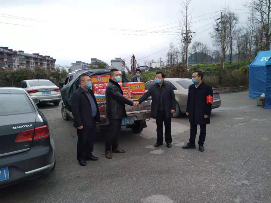 六枝永康骨傷科醫院院長、社員劉俊(左二)捐贈方便面、牛奶等價值8000元的慰問物資給水黃路郎岱鎮卡點的疫情防控一線工作人員。