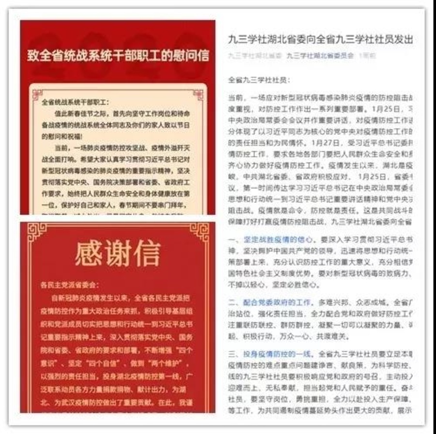 九三學(xué)社湖北省委會積極宣傳報道,號召全省社員積極行動起來,齊心協(xié)力抗擊新冠肺炎。1月23日,九三學(xué)社中央常務(wù)副主席邵鴻受武維華主席的委托,致電社湖北省委主委秦順全,聽取情況匯報,對武漢新型肺炎疫情表示深度關(guān)切,代表社中央慰問湖北省九三學(xué)社社員,并對積極參與疫情防控提出要求和希望。1月23日至25日,九三學(xué)社湖北省委宣傳平臺分別轉(zhuǎn)發(fā)了社武漢市委青年工作委員會的《眾志成城 戰(zhàn)勝肺炎――致全體社員的一封倡議書》,《爾肯江·吐拉洪部長致全省統(tǒng)戰(zhàn)系統(tǒng)干部職工的慰問信》,《省委統(tǒng)戰(zhàn)部倡議書:眾志成城團結(jié)一心 在疫情防控考驗中貢獻統(tǒng)戰(zhàn)力量》等文章;1月28日,九三學(xué)湖北社省委發(fā)出《致全省九三學(xué)社社員的倡議書》,號召全省九三社員行動起來,共同抗擊新型肺炎,用社內(nèi)宣傳媒體凝聚起全省九三學(xué)社社員的思想共識。