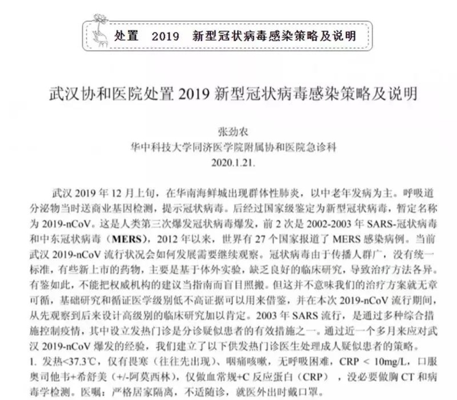 張勁農(nóng)主任針對新冠肺炎疫情撰寫專題文章在家隔離治療期間,張勁農(nóng)沒停止工作,他“隔空”閱片、討論病例、參與會診,還在家中起草了《武漢協(xié)和醫(yī)院上呼吸道感染及病毒樣肺炎初步診療方案》,為有效控制疫情提供了“協(xié)和方案”。隔離治療一周后,張勁農(nóng)逐漸恢復(fù)。他說:“康復(fù)后,我將繼續(xù)投入這場戰(zhàn)斗,與大家并肩作戰(zhàn)。”