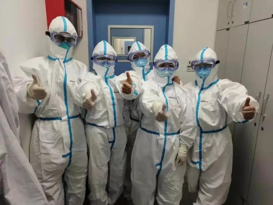 ▲馮俊教授與同事在武漢同濟醫(yī)院新冠肺炎住院部合影。