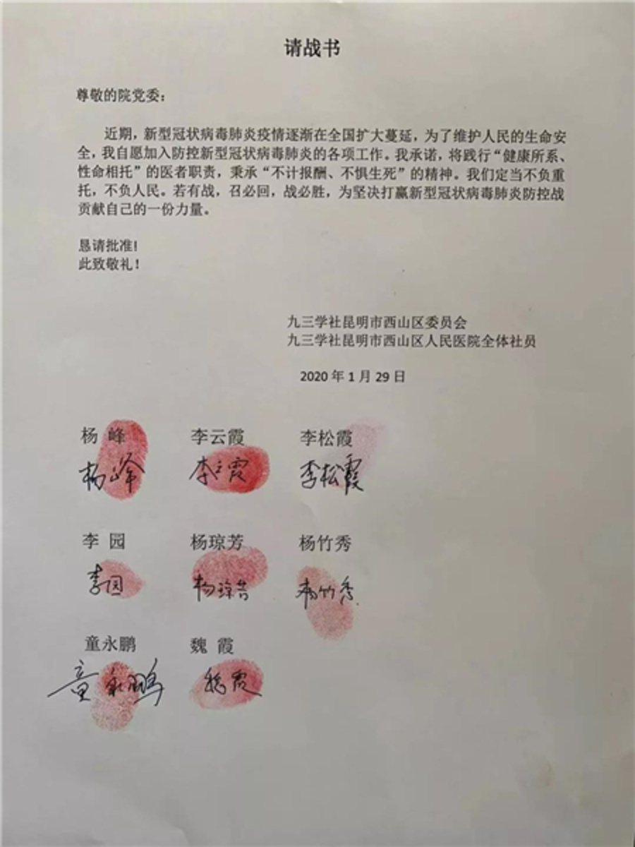 社西山區(qū)委西山區(qū)人民醫(yī)院全體社員請戰(zhàn)書及合影