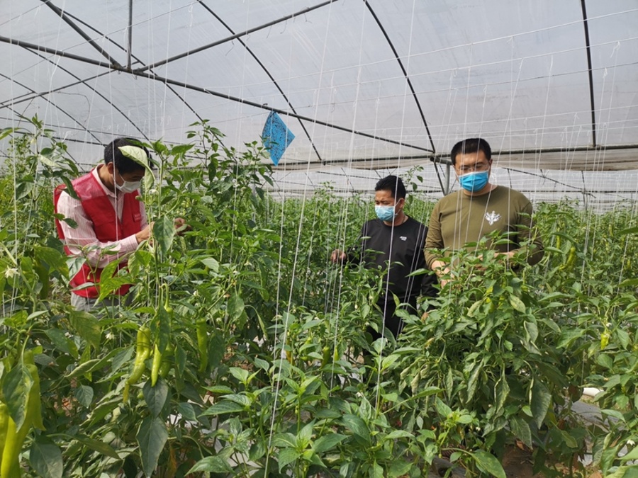 九三學(xué)社社員、廣西北海市駐村扶貧工作隊(duì)員潘蔭華(左一)在進(jìn)行大棚辣椒田間管理工作
