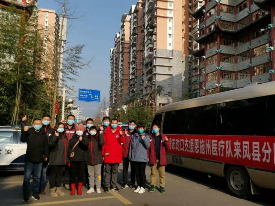 2月13日一大早,各小分隊在領取醫用防護物資后,隨即動身趕赴各定點醫院。董欣所在的小分隊驅車兩個來小時來到來鳳縣政府。來鳳縣以鳳凰飛臨的傳說得名,是一個居住著17個民族的多民族聚居縣,土家族屬本地世居民族。聽取縣政府有關負責同志的情況介紹后,隊員們根據自己的專業特長分赴不同的崗位。董欣他們奔赴來鳳縣中心醫院,聽院領導介紹了解到,按照確診病人、疑似病人、不能排除新冠肺炎的發熱病人將病區分為三個科,分別收治三類患者。來鳳縣的新冠肺炎確診病人在整個恩施州是比較少的,全縣只有12人,而且當地的醫護人員是充足的。主要問題是對新冠肺炎的認知存有偏差,治療上存在分歧。當然,隨著對疾病認識的深入和診療經驗的積累,國家衛健委對新冠肺炎的診療方案也在不斷進行修訂,目前已經修訂到第七版了。天津醫療隊的主要任務是指導、幫助當地醫務人員全力救治患者,堅決防止輕癥轉重癥,提高治愈率。而對于極少數重癥患者,將統一轉到恩施州醫院進行集中救治,以減少死亡率。