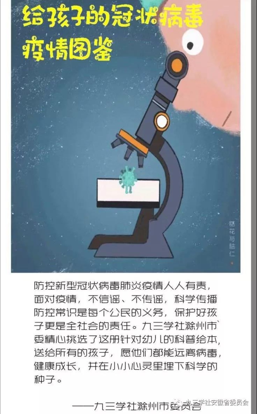 “講科普”是九三學社服務社會的一面旗幟。特殊時期,九三學社滁州市委開展了一次特別的科普服務。“九三學社滁州市委精心挑選了這冊針對幼兒的科普繪本”,送給所有的孩子,愿他們都能遠離病毒,健康成長,并在小小心靈里埋下科學的種子。” 九三學社滁州市委副主委丁曉麗組織社內專家、機關工作人員整理選編了兩冊兒童科普電子讀物《給孩子的冠狀病毒疫情圖鑒》和《不一樣的春節》,在社內外推廣,并推薦給教育部門。