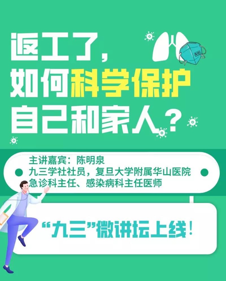 2月4日,在錢鋒主委的關心支持下,最小體量的科普講座——“九三”微講壇在社市委微信公眾號和千聊平臺緊急上線,復旦大學附屬華山醫院急診科主任、感染病科主任醫師陳明泉受邀請作題為“返崗了,如何保護好自己和家人”的微講座,彰顯疫情面前“九三人”尊重科學、傳播科學的擔當和作為,在社內外產生良好反響。