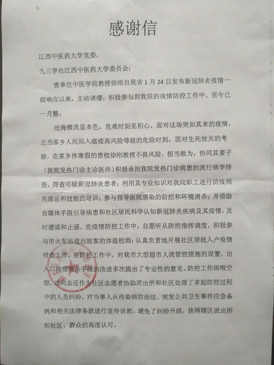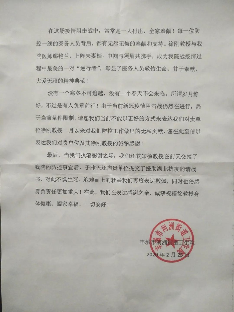 2月23日,在交接了家鄉豐城市河州街道衛生院的防控事宜后,在一天后的24日,徐剛就向學校提交了援助湖北抗疫的請戰書,用行動詮釋醫者、師者的使命擔當,為全校師生員工樹立了榜樣!