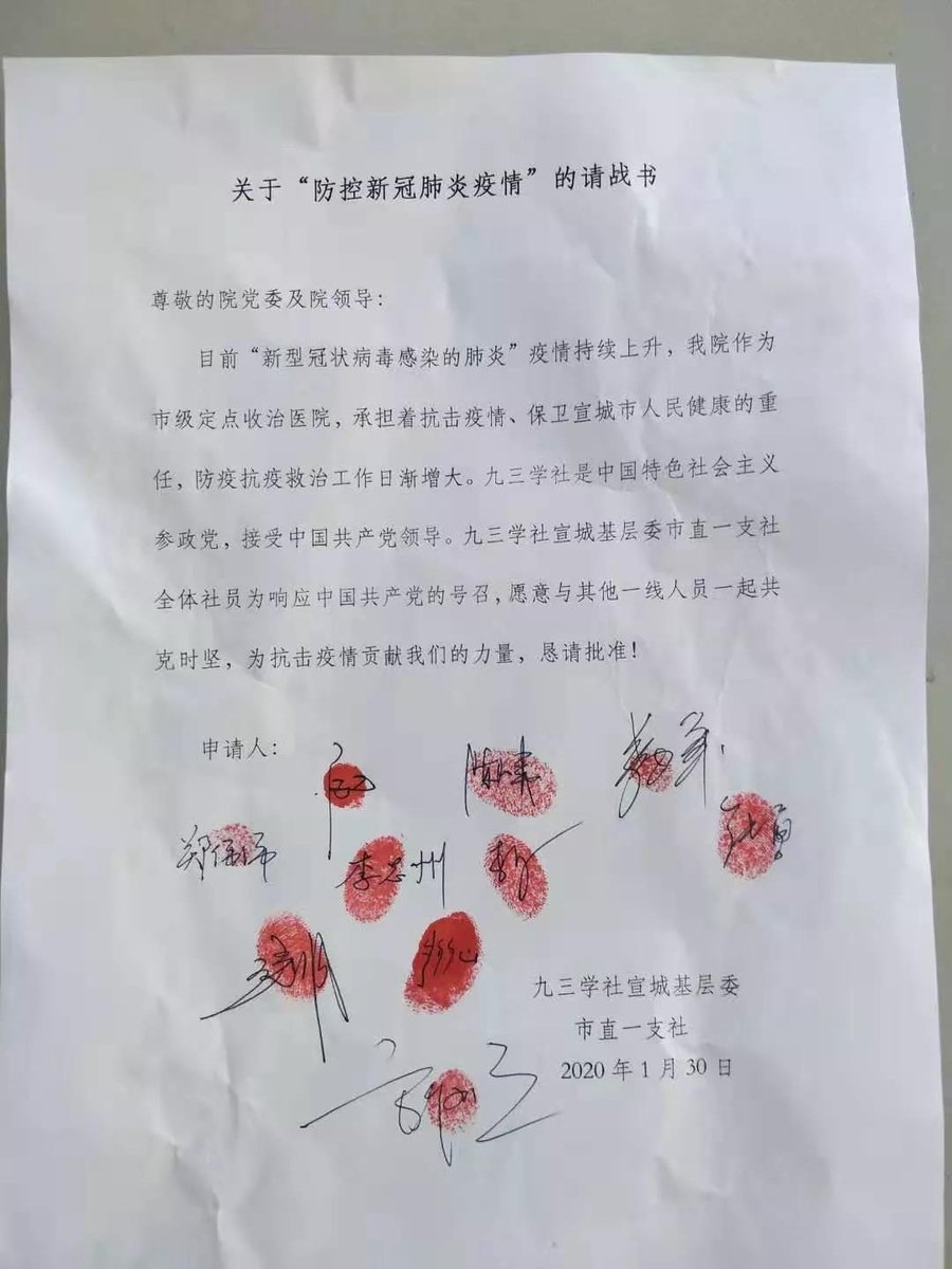 宣城市人民醫院是新冠肺炎疫情市級定點醫療機構。關鍵時刻,宣城市基層委市直一支社十余名社員,逆流而上、挺身而出,共同寫下“請戰書”,申請投身到抗“疫”一線。