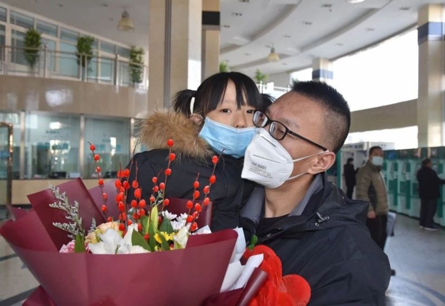 2月19日,張韶橘隨第五批甘肅省援助湖北醫(yī)療隊馳援武漢。從年前至今,張韶橘已經(jīng)在發(fā)熱門診抗疫第一線連續(xù)奮戰(zhàn)了整整一個月。在定西市舉行的出征儀式上,同在一個醫(yī)院工作的妻子帶著女兒涵涵前來為他送行,張韶橘一把將女兒抱在懷中,依依不舍地叮囑:“聽媽媽的話,等著爸爸回來。爸爸給你和媽媽獻(xiàn)上最美的花束。”