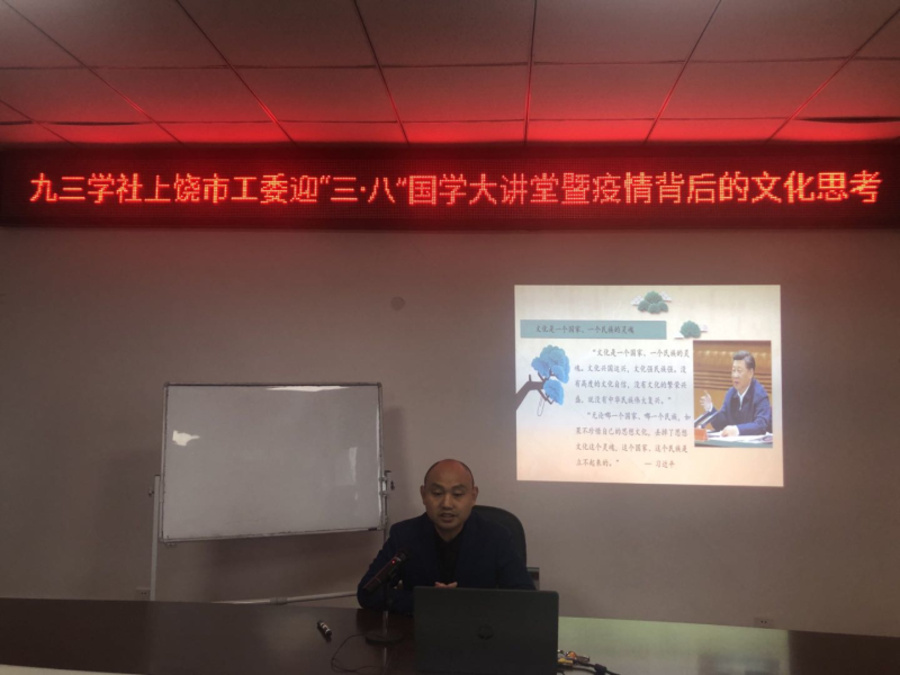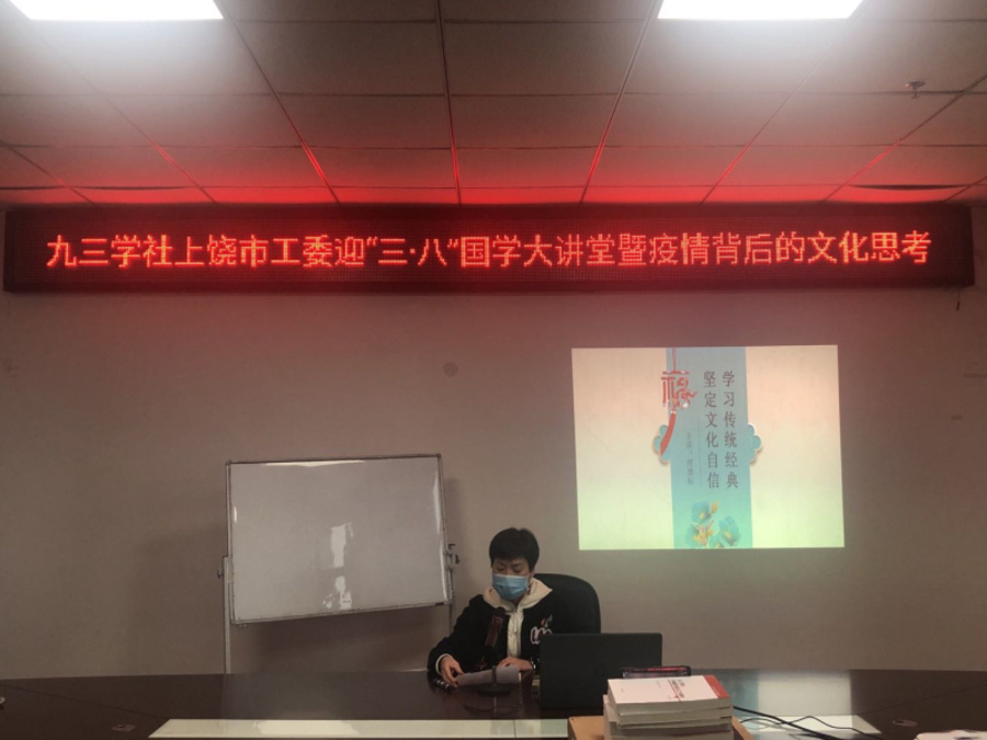3月8日下午,九三學社上饒市工委開展了慶“三八”國學大講堂暨疫情背后的文化思考活動。與以往上課形式不同的是,本次講座在互聯網上采用視頻直播的方式進行。社市工委專職副主委樊桂芳主持活動并講話。
