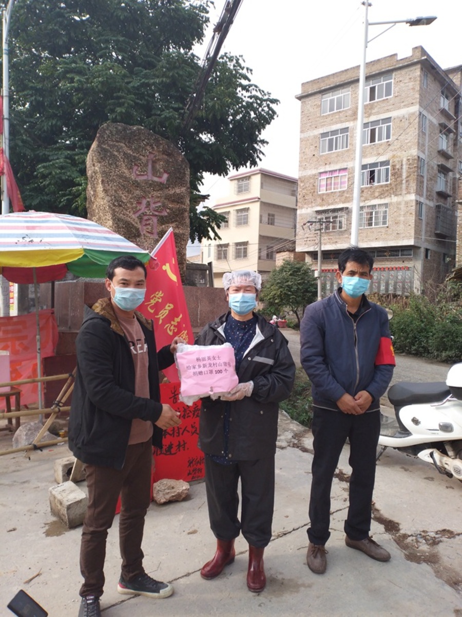 面對來勢洶洶的新型冠狀肺炎疫情,2月12日,玉林市福綿區樟木鎮新龍山背村防控疫情值勤人員沒有口罩了。九三學社廣西區委宣傳部原部長楊麗英了解到這一緊急情況后,迅速行動、立即聯系社區委和九三社員援助。
