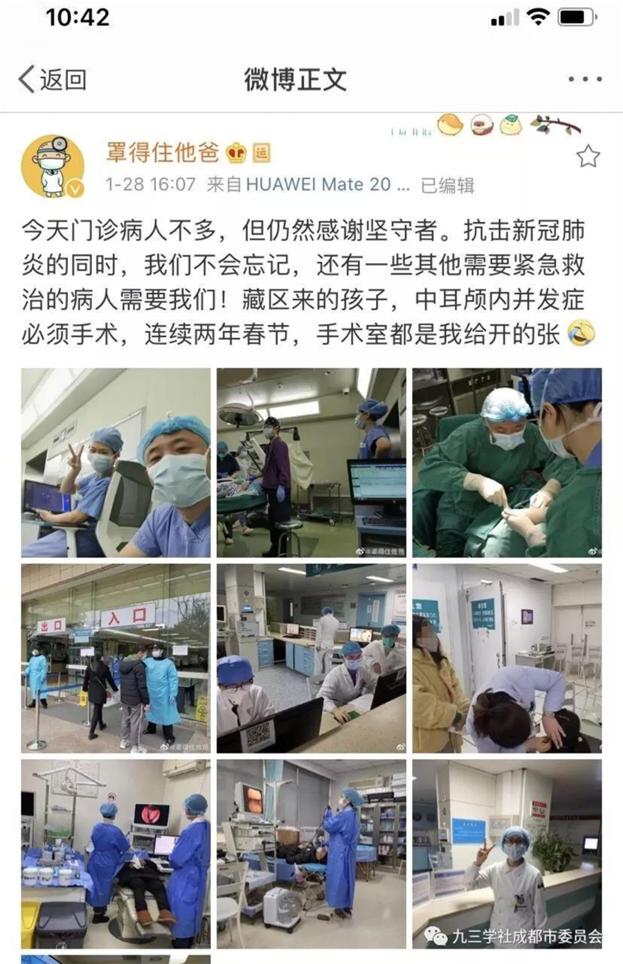 九三學(xué)社四川大學(xué)委員會副主委、九三學(xué)社成都市青年工作委員會主任、四川大學(xué)耳鼻喉頭頸外科副主任趙宇----微博名“罩得住他爸”在1月28日微博中寫到:“今天門診病人不多,但仍然感謝堅(jiān)守者。抗擊新冠肺炎的同時,我們不會忘記,還有一些其他需要緊急救治的病人需要我們!藏區(qū)來的孩子,中耳顱內(nèi)并發(fā)癥必須手術(shù),連續(xù)兩年春節(jié),手術(shù)室都是我給開的張。”還有許許多多的九三人,他們用勇敢與堅(jiān)守,奉獻(xiàn)與堅(jiān)持,為生命站崗,為希望起航,向所有堅(jiān)持在一線崗位上的白衣天使致敬。