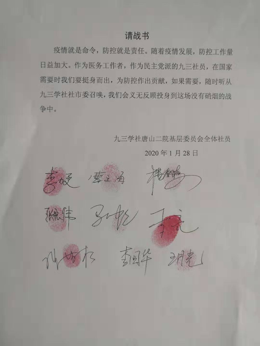二院基層委員會的社員們,春節期間取消假期,全部堅守在工作崗位上,同樣奮戰在一線:大年三十、初一堅守門診,初二三四堅守在病房手術室,雖然是專科醫院,對疾病防控也是義不容辭,自覺為群眾安全舍小家顧大家。看到全國各地的醫護人員在支援武漢一線,他們積極行動,鄭重簽下請戰書,表示聽從社組織和院黨委的召喚,為阻擊疫情勇做貢獻。