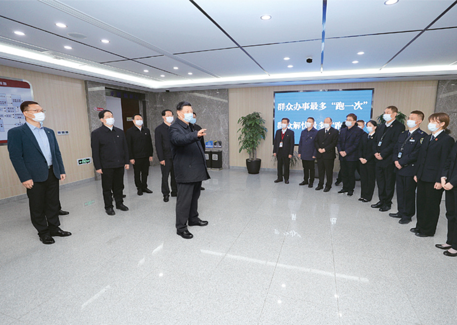 2020年3月29日至4月1日,中共中央總書記、國家主席、中央軍委主席習近平在浙江考察。這是3月30日,習近平在湖州市安吉縣社會矛盾糾紛調處化解中心,了解群眾矛盾糾紛一站式接收、一攬子調處、全鏈條解決模式運行情況。 新華社記者 鞠鵬/攝